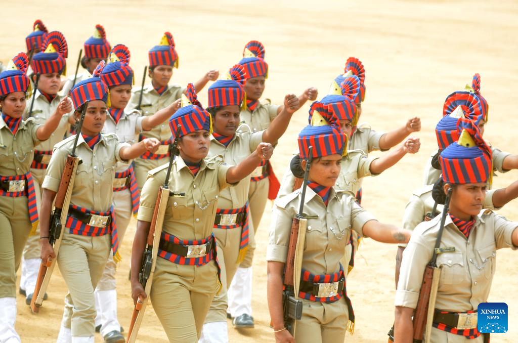 Indian Police personnel march during India's Independence Day celebrations, in Bangalore, India, Aug. 15, 2022. (Str/Xinhua)