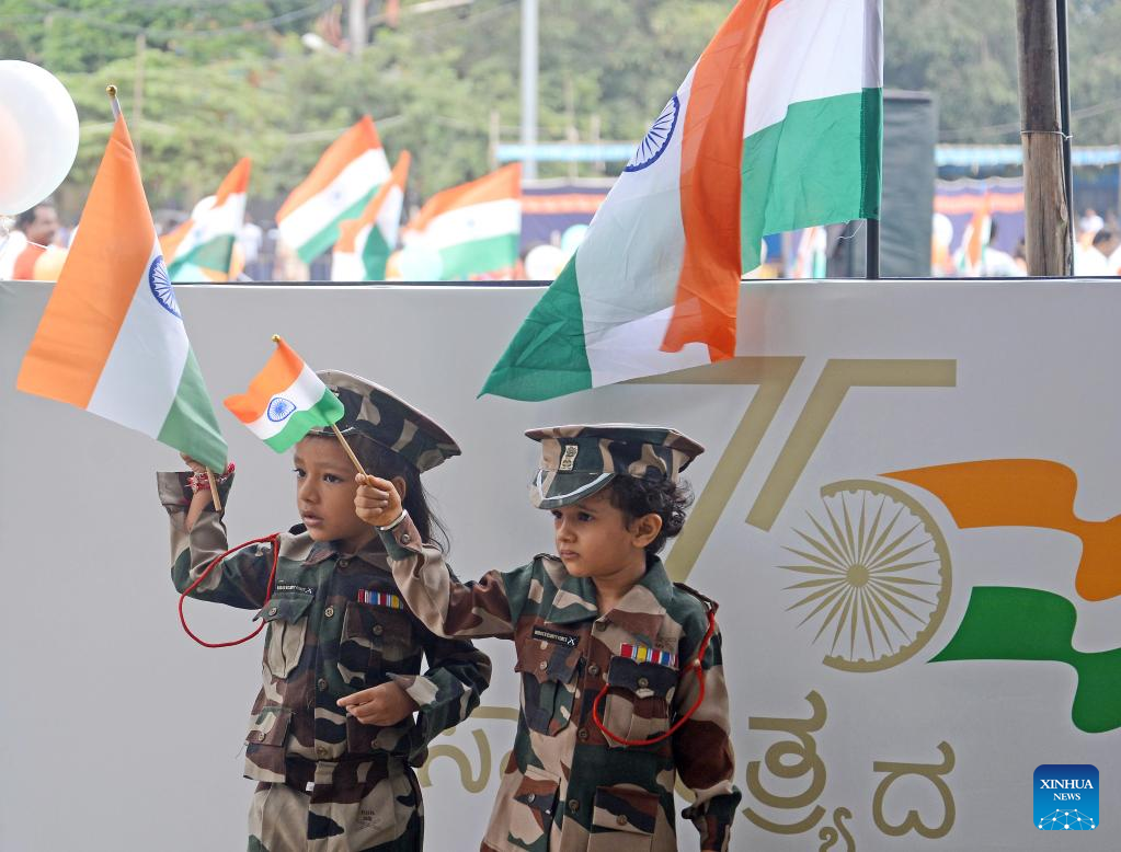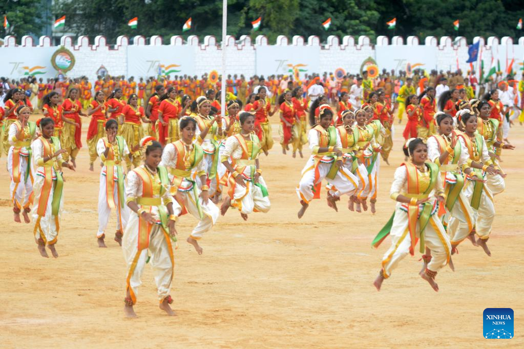 School children perform during India's Independence Day celebrations, in Bangalore, India, Aug. 15, 2022. (Str/Xinhua)