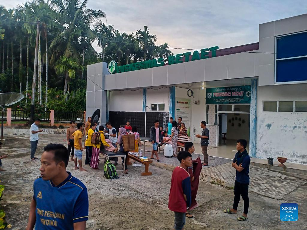 Cellphone photo provided by Indonesia's National Disaster Management Agency (BNPB) shows people gathering outside a public health building after an earthquake hit the province of West Sumatra, Indonesia, Sept. 11, 2022. A powerful earthquake struck off Indonesia's western province of West Sumatra on Sunday, but did not leave casualties, officials and an agency said. Earlier, the country's meteorology, climatology and geophysics agency released a 6.1-magnitude earthquake and then revised it to a 6.2 Richter scale, Head of the Quake and Tsunami Division of the Meteorology, Climatology and Geophysics Agency named only Daryono said. (BNPB/Handout via Xinhua)
