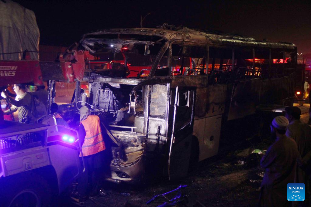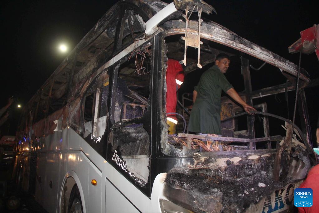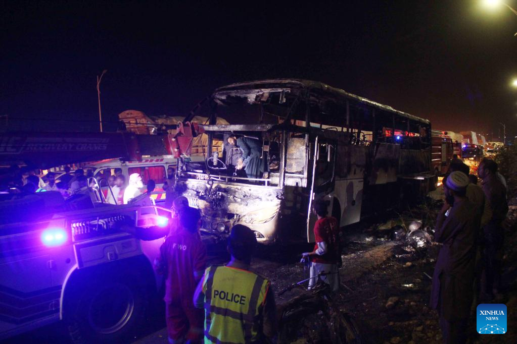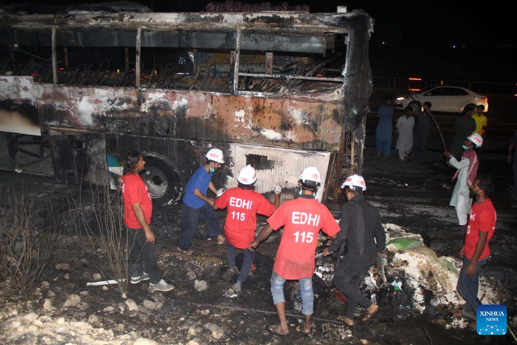 ISLAMABAD, Oct. 13 (Xinhua) -- At least 18 people, including eight children, were killed and 28 others injured on Wednesday night after a passenger bus caught fire in Pakistan's southern Jamshoro district, police said on Thursday.