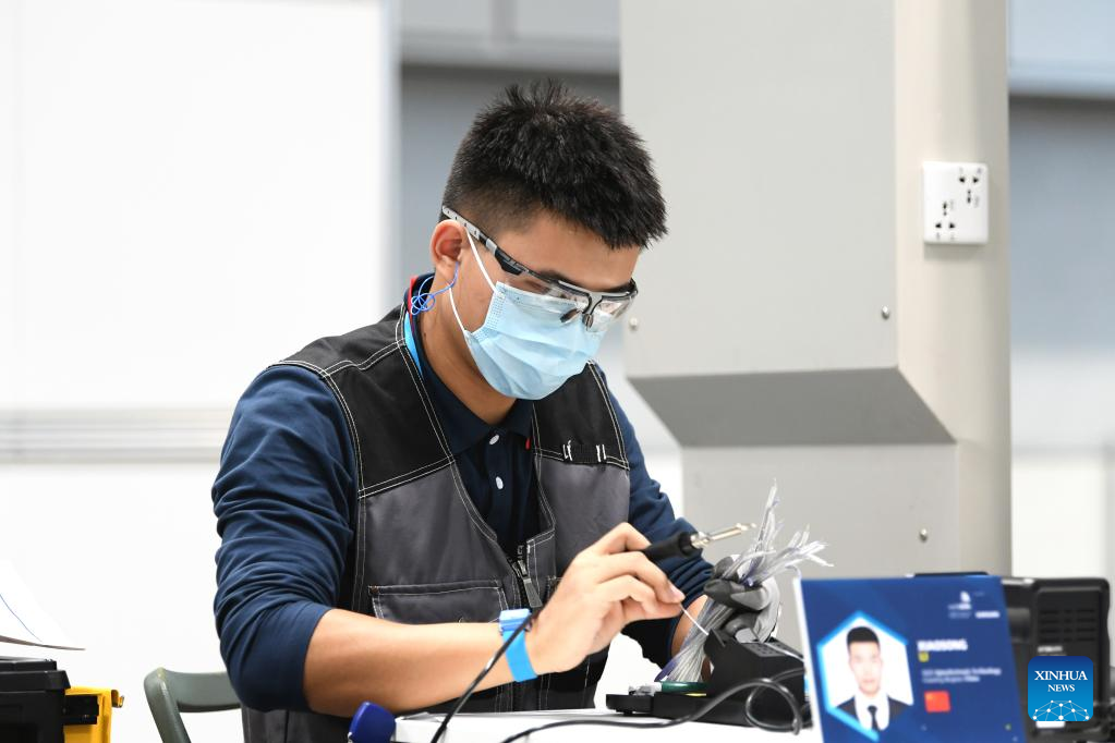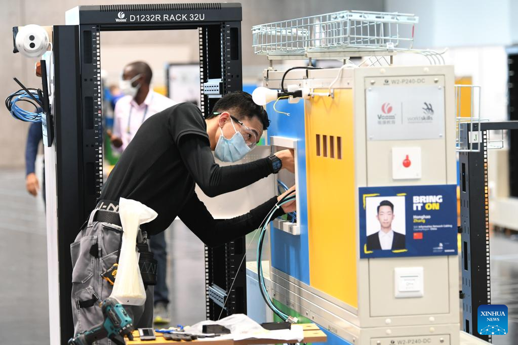 The contests are being held by Kyoto on Oct. 15-18 as part of WorldSkills Competition 2022 Special Edition: information network cabling, optoelectronic technology and renewable energy. (Xinhua/Hua Yi)