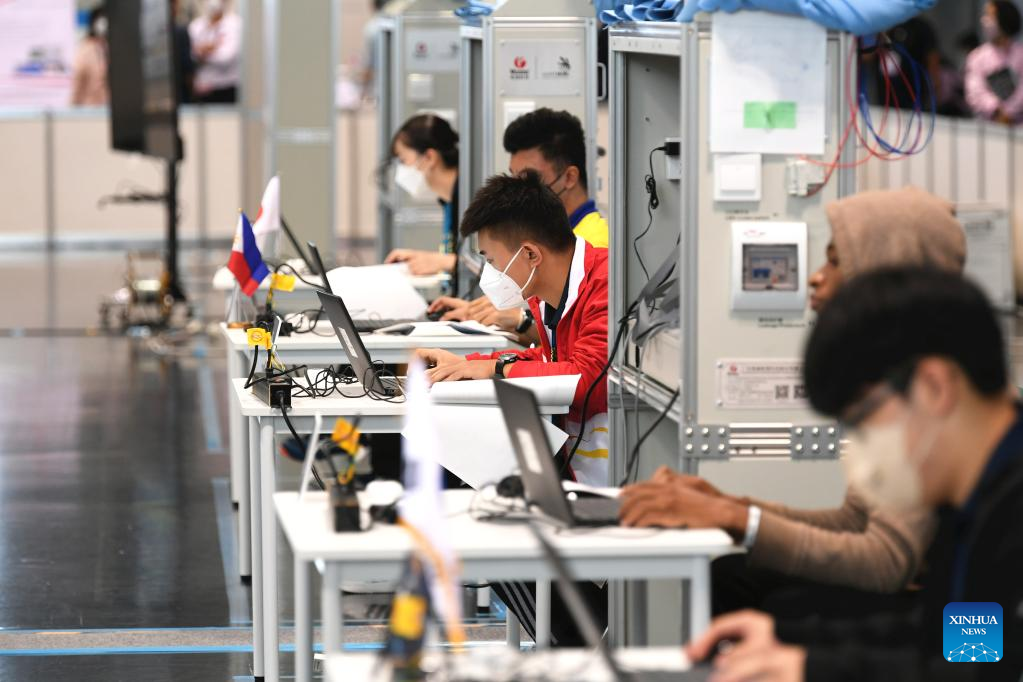 Li Xiaosong (C), a student from Chongqing College of Electronic Engineering, participates in a contest during the WorldSkills Competition 2022 Special Edition in Kyoto, Japan, Oct. 18, 2022.