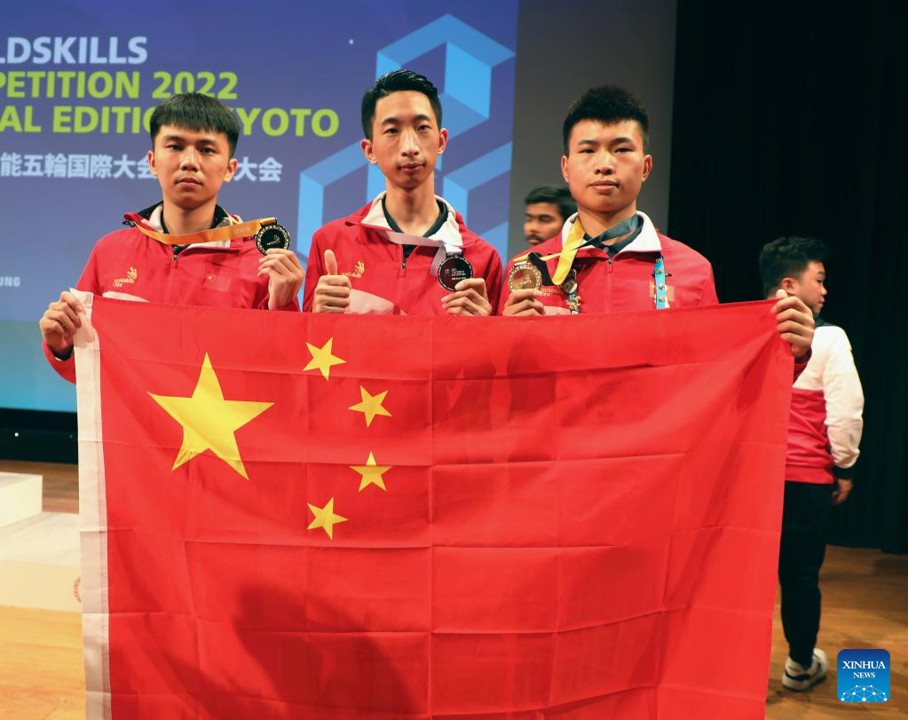 TOKYO, Oct. 19 (Xinhua) -- Three Chinese young technicians won two gold and one silver medals in all three contests on Wednesday in the WorldSkills Competition 2022 Special Edition held in Japan's Kyoto.