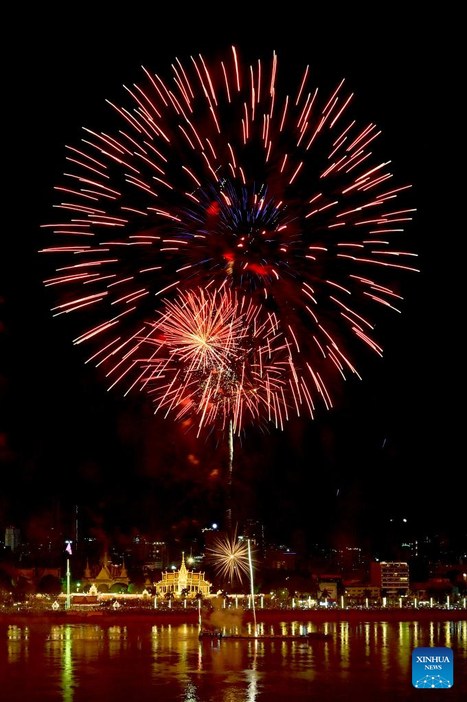 Fireworks are seen during the Independence Day celebration in Phnom Penh, Cambodia, Nov. 9, 2022. (Xinhua/Yue Yuewei)