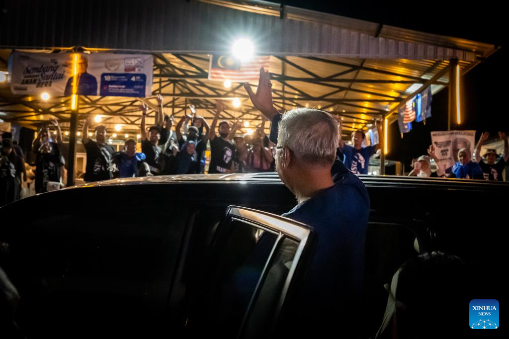 Malaysian caretaker Prime Minister Ismail Sabri Yaakob waves to supporters after a campaign event ahead of the general election in Bera, Malaysia, Nov. 18, 2022. Malaysia will hold the general election on Nov. 19. (Xinhua/Zhu Wei)