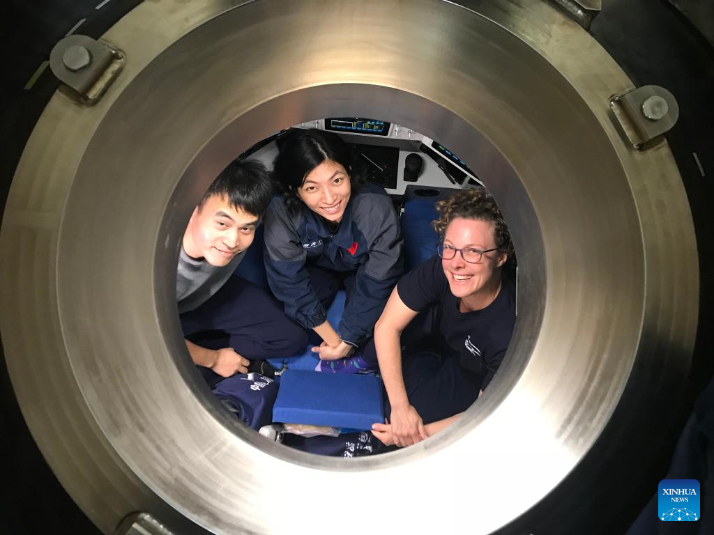 Submersible pilots Deng Yuqing (C) and Yuan Xin (L) from China's Institute of Deep-Sea Science and Engineering (IDSSE) of the Chinese Academy of Sciences, and New Zealand Marine biologist Dr. Kareen Schnabel from the National Institute of Water and Atmospheric Research, prepare for their expedition to the Kermadec Trench onboard China's research vessel Tansuoyihao, Nov. 4, 2022. (Chen Kunxin/IDSSE/Handout via Xinhua)