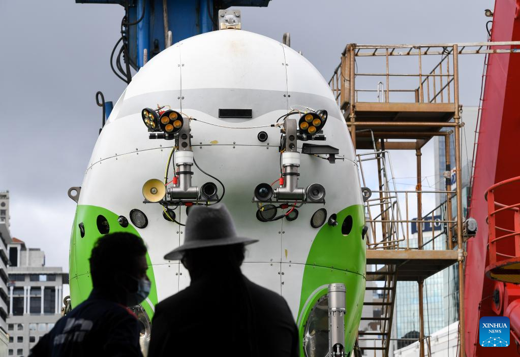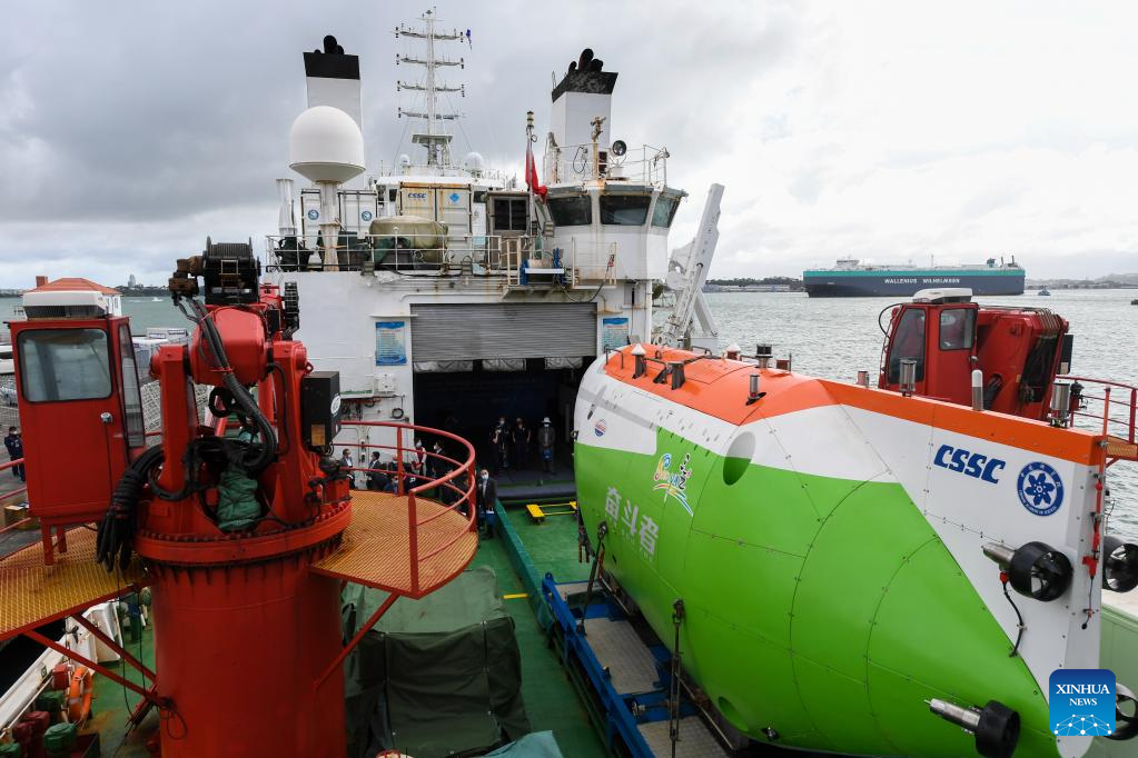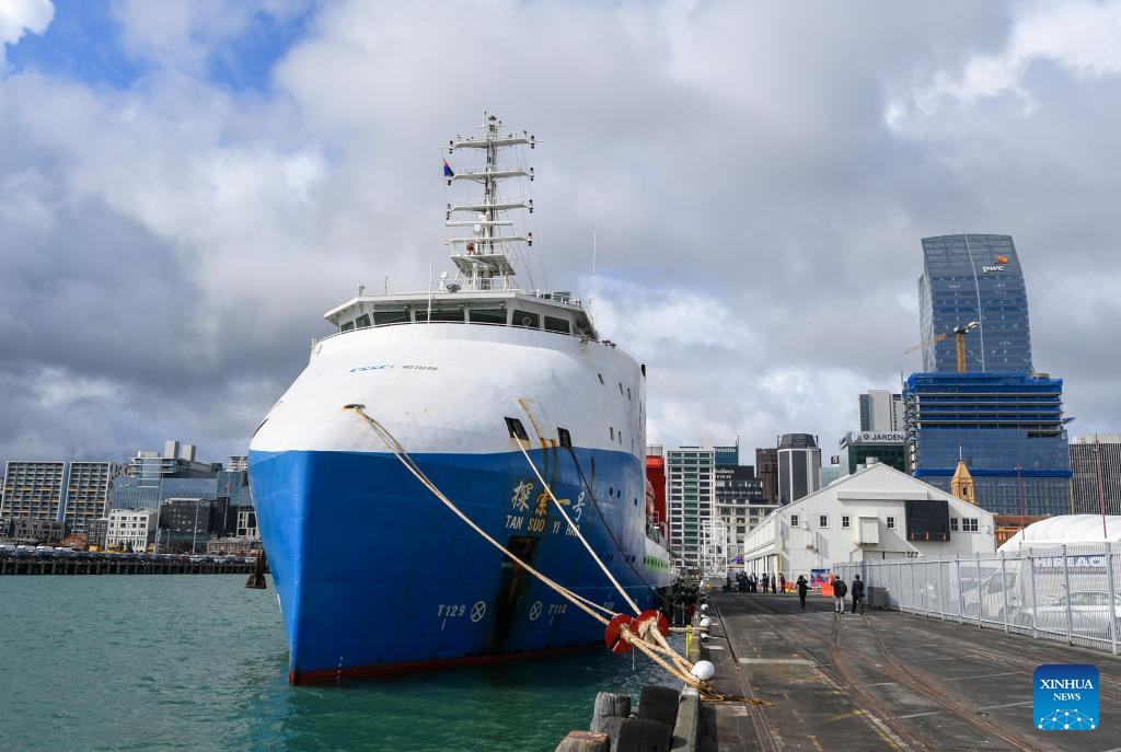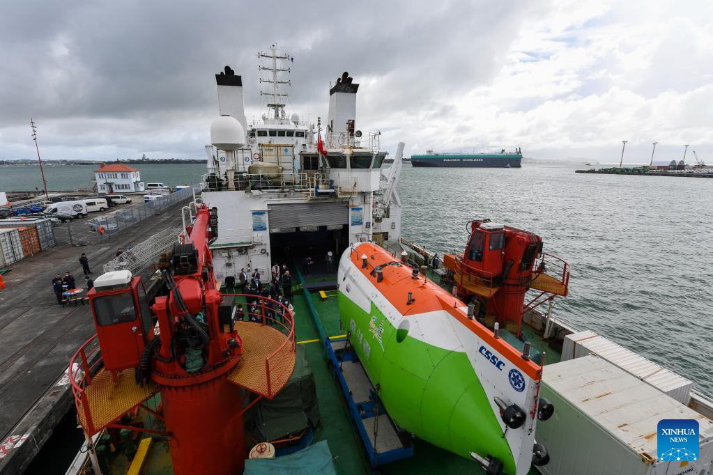 China's research vessel Tansuoyihao loaded with the Human Occupied Vehicle Fendouzhe docks at Queens Wharf in Auckland, New Zealand, Nov. 27, 2022. (Xinhua/Guo Lei)