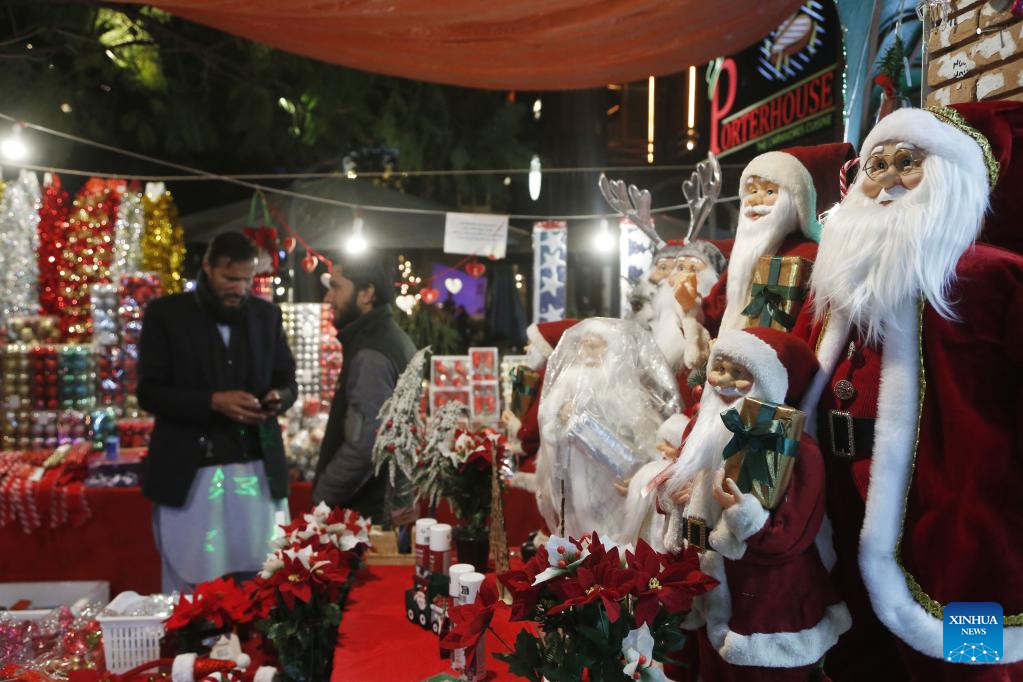Christmas decorations are pictured at a shop on Christmas Eve in Islamabad, Pakistan, Dec. 24, 2022. (Xinhua/Ahmad Kamal)