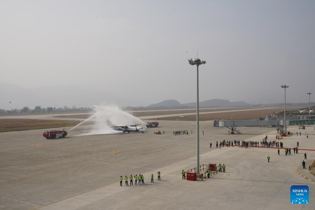 A Buddha Air flight is saluted with water cannon when it lands at Pokhara International Airport in Pokhara, Nepal, Jan. 1, 2023. As Pokhara International Airport, a national pride project of Nepal, was inaugurated on Sunday, Nepali Prime Minister Pushpa Kamal Dahal laid emphasis on its contribution to national and regional development. (Photo by Hari Maharjan/Xinhua)