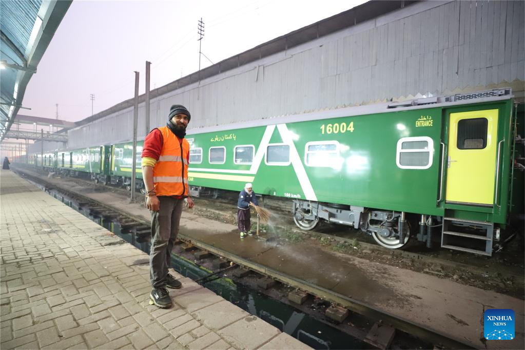 A staff member at Lahore station of Pakistan Railways stands in front of train coaches imported from China in Pakistan's eastern city of Lahore on Jan. 5, 2023. Train coaches imported from China are completely compatible with the local track, and have been approved for a commercial run after the initial trial at one of the fastest tracks in Pakistan, a Pakistani official said. (Xinhua/Jiang Chao)