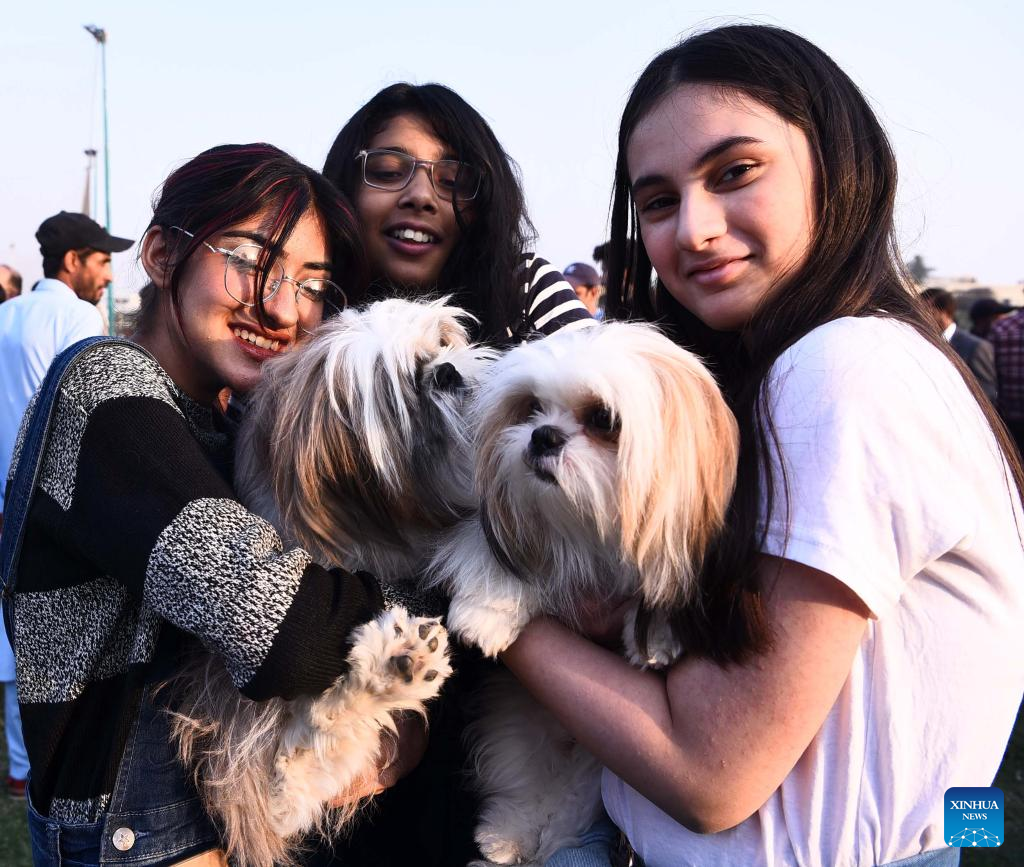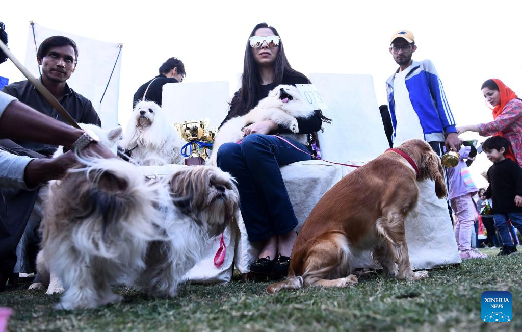 Participants are seen with their dogs during a dog show in southern Pakistani port city of Karachi on Jan. 8, 2023. (Str/Xinhua)