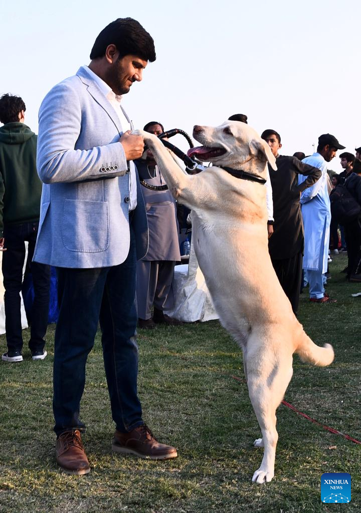 A man plays with his dog during a dog show in southern Pakistani port city of Karachi on Jan. 8, 2023. (Str/Xinhua)