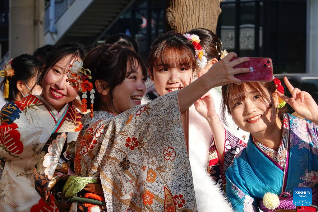 Teenagers take part in a Coming of Age Day ceremony in Yokohama, Japan, Jan. 9, 2023. Coming of Age Day is a public holiday in Japan held annually on the second Monday of January. With the enactment of the revised Civil Code last April, the age of adulthood was lowered to 18 from 20. (Xinhua/Zhang Xiaoyu)