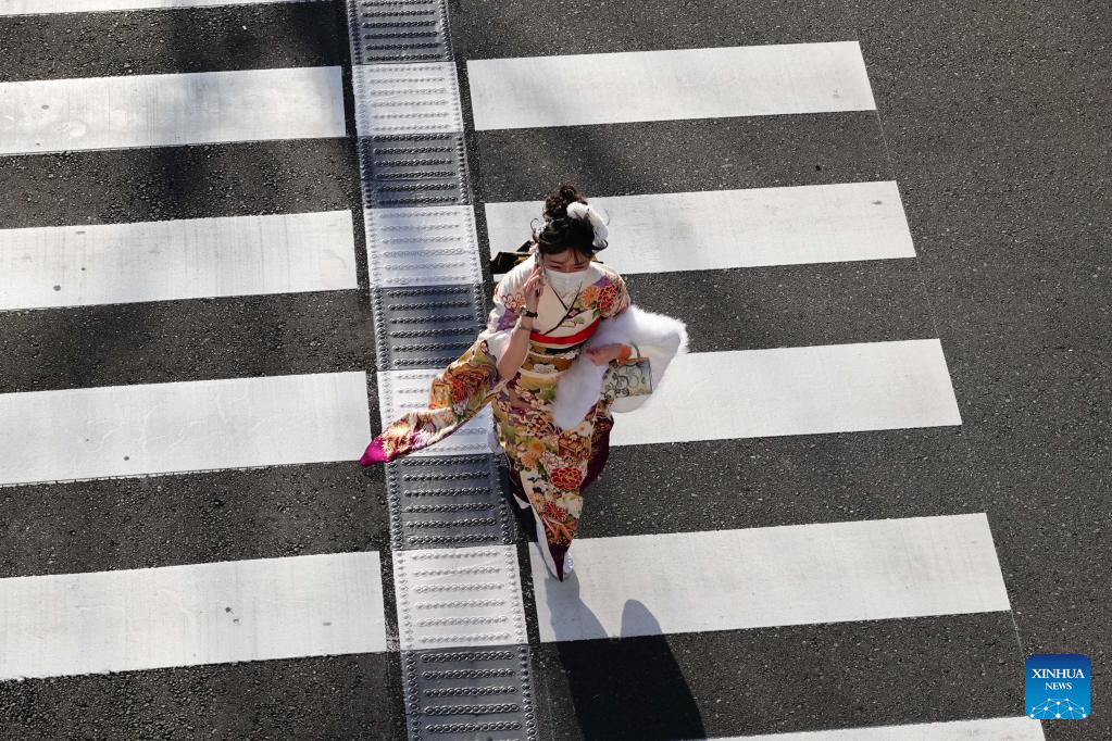 A girl in kimono takes part in a Coming of Age Day ceremony in Yokohama, Japan, Jan. 9, 2023. Coming of Age Day is a public holiday in Japan held annually on the second Monday of January. With the enactment of the revised Civil Code last April, the age of adulthood was lowered to 18 from 20. (Xinhua/Zhang Xiaoyu)
