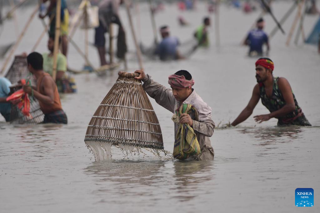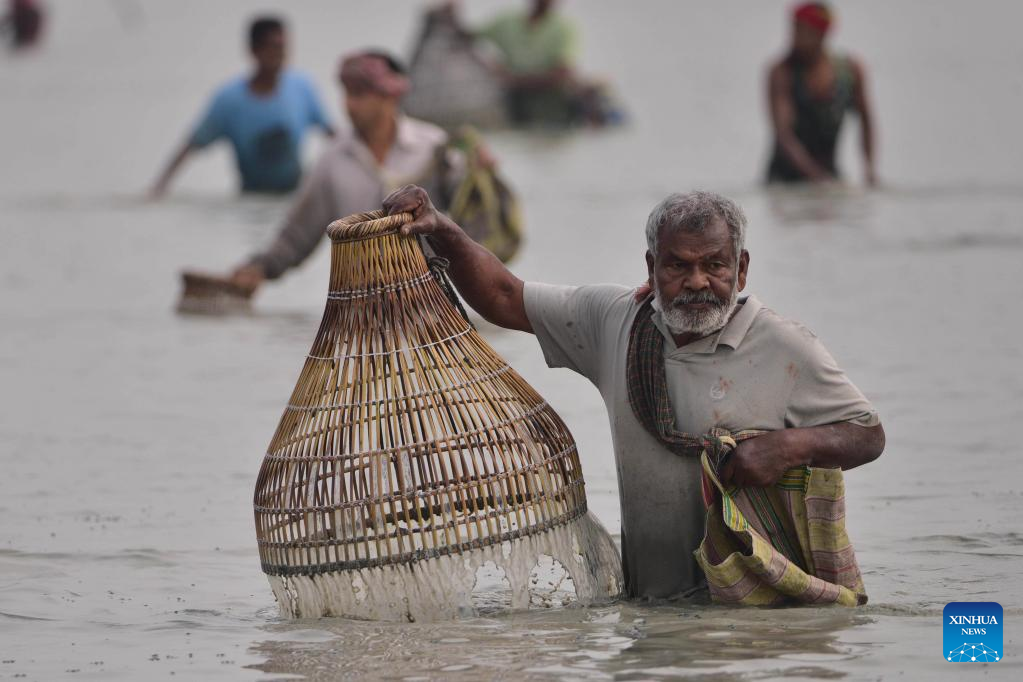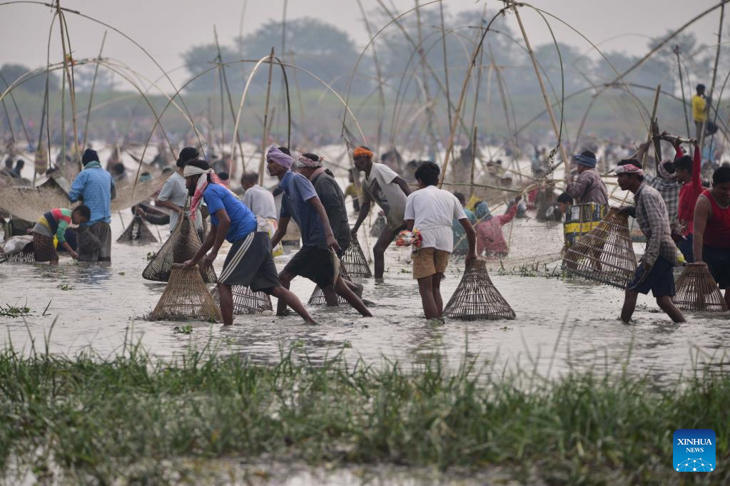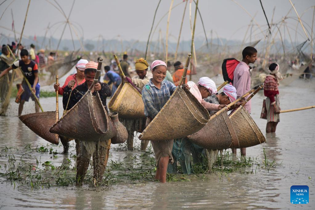 People participate in community fishing during Bhogali Bihu, a festival marking the end of the winter harvesting season, in Nagaon district, Assam state, India, on Jan. 13, 2023. (Str/Xinhua)