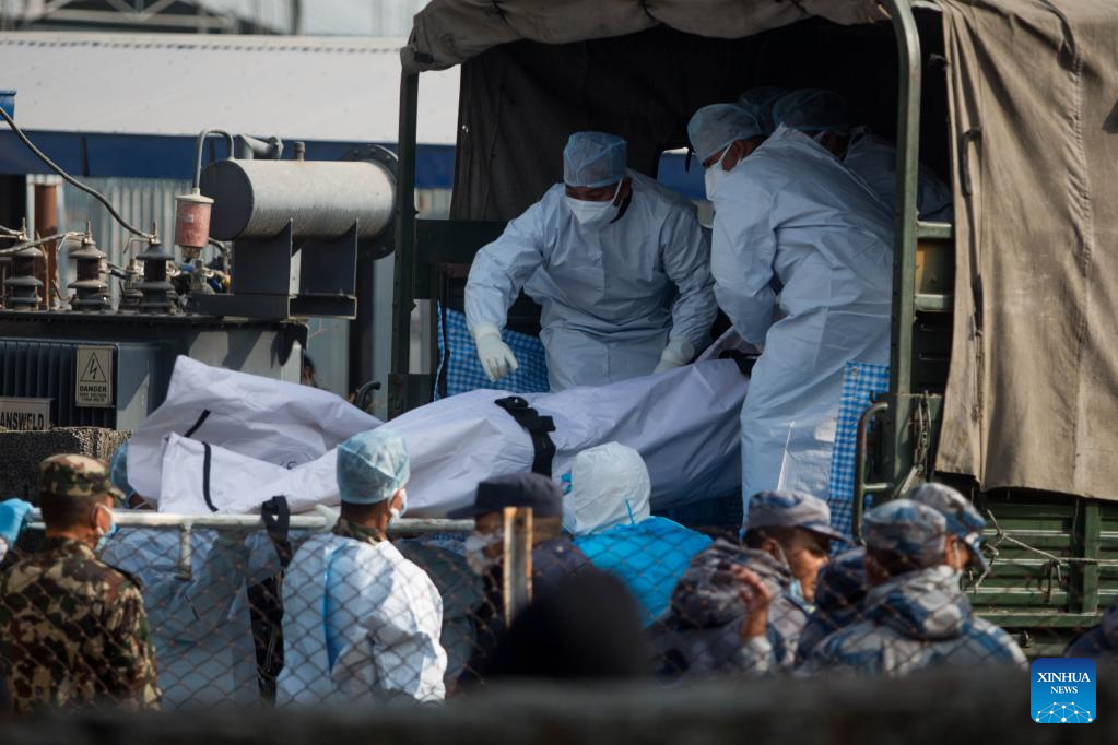 Staff members carry the remains of victims in a Yeti Airlines plane crash accident onto trucks in Pokhara, Nepal, Jan. 17, 2023. The victims' remains will later be transfered to Kathmandu, capital of Nepal.