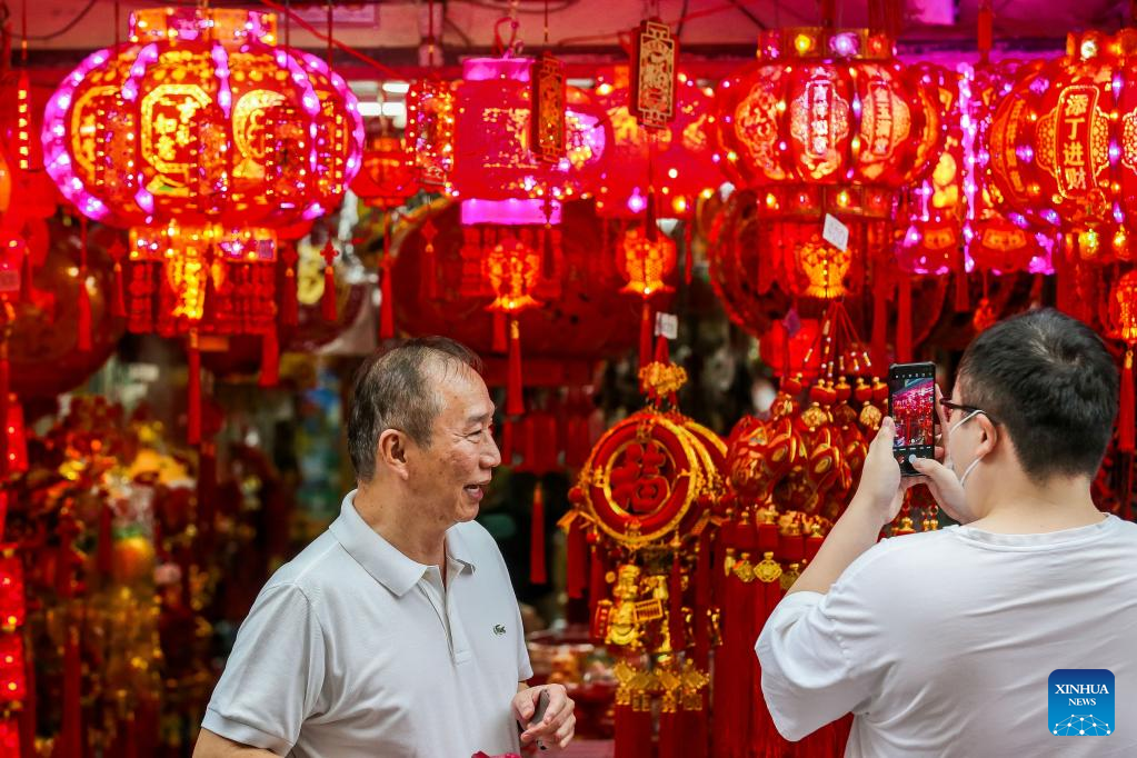 A customer takes pictures of decorations for the upcoming lunar New Year at the Chinatown in Manila, the Philippines, Jan. 18, 2023. (Xinhua/Rouelle Umali)