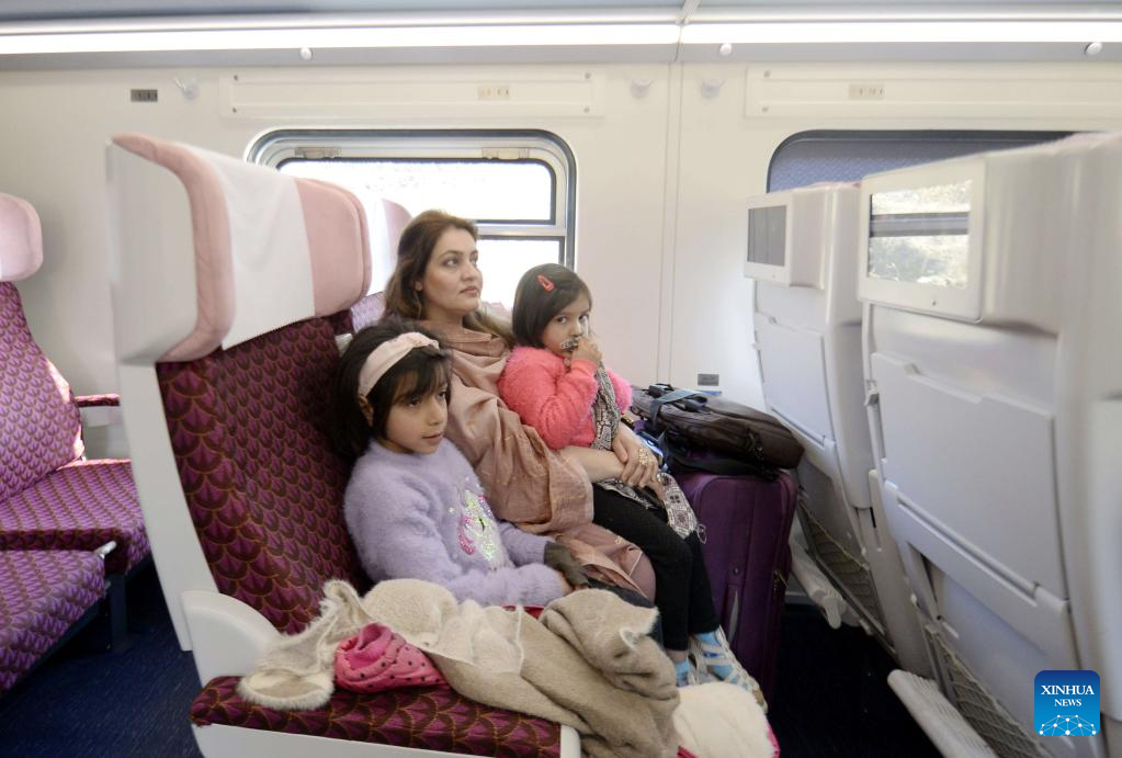 Passengers travel in a train coach imported from China at a railway station in Islamabad, capital of Pakistan, Jan. 27, 2023. Pakistani Prime Minister Shahbaz Sharif said on Friday that the newly imported train coaches from China will help Pakistan Railways to attract passengers and increase revenue. (Xinhua/Ahmad Kamal)