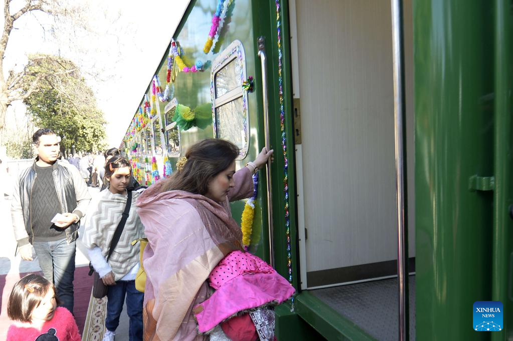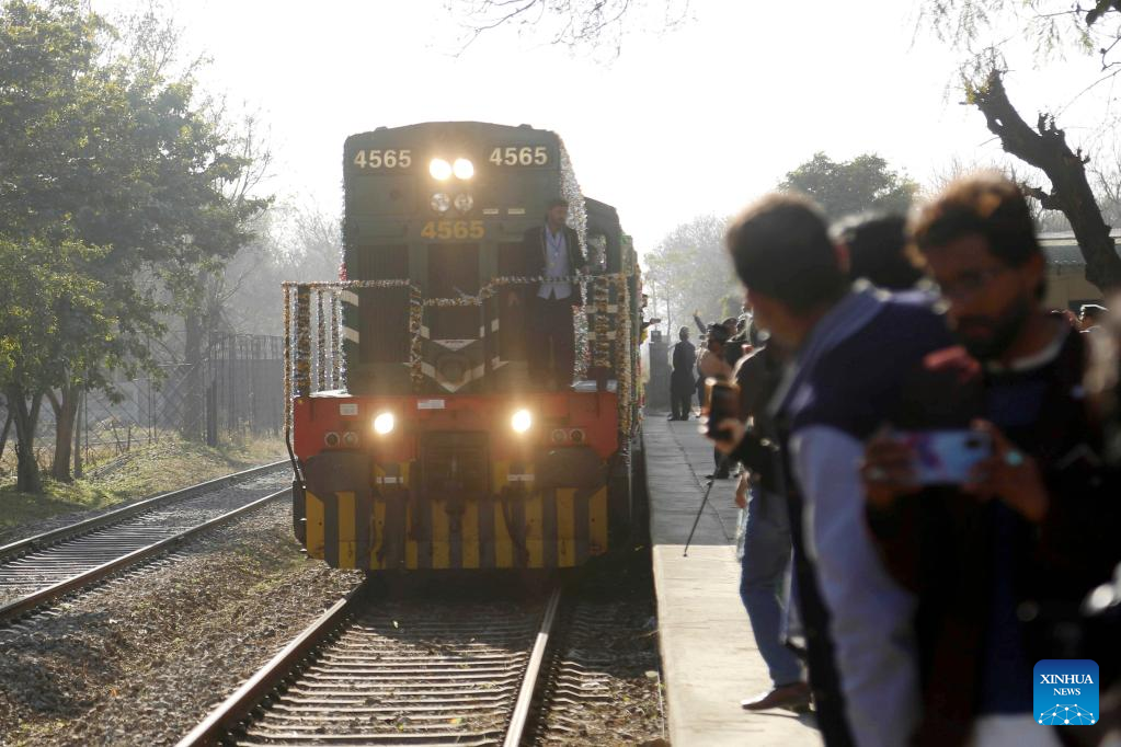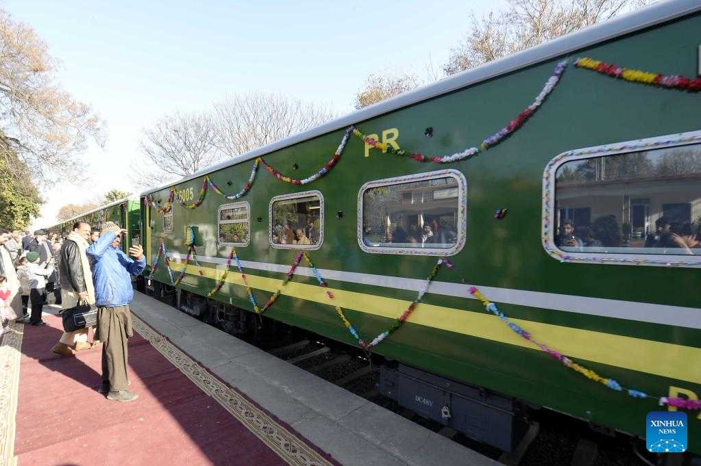 A train equipped with coaches imported from China arrives at a railway station in Islamabad, capital of Pakistan, Jan. 27, 2023. Pakistani Prime Minister Shahbaz Sharif said on Friday that the newly imported train coaches from China will help Pakistan Railways to attract passengers and increase revenue. (Xinhua/Ahmad Kamal)