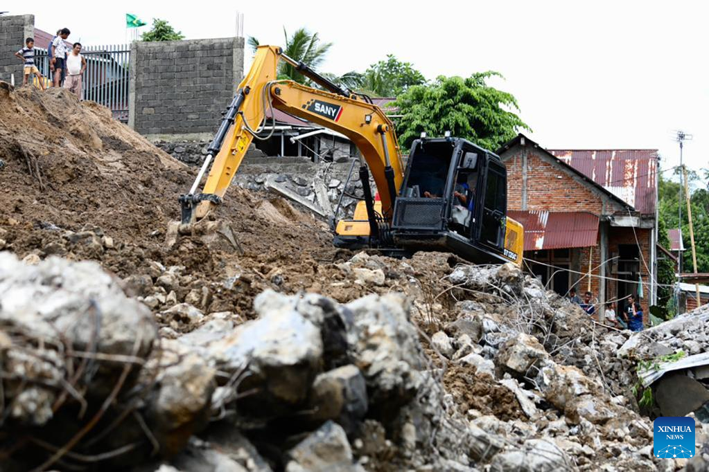This photo provided by Indonesia's National Disaster Management Agency (BNPB) shows a worker cleaning mud and debris with an excavator near a damaged house after flood in Manado, North Sulawesi, Indonesia, Jan. 30, 2023. One people died after floods 80 to 300 cm high destroyed dozens of homes in Indonesia's North Sulawesi on Friday. At least five sub-districts have been flooded, and 33 houses in six sub-districts have experienced landslides, as the authorities continue to assess the situation on the ground. (BNPB/Handout via Xinhua)