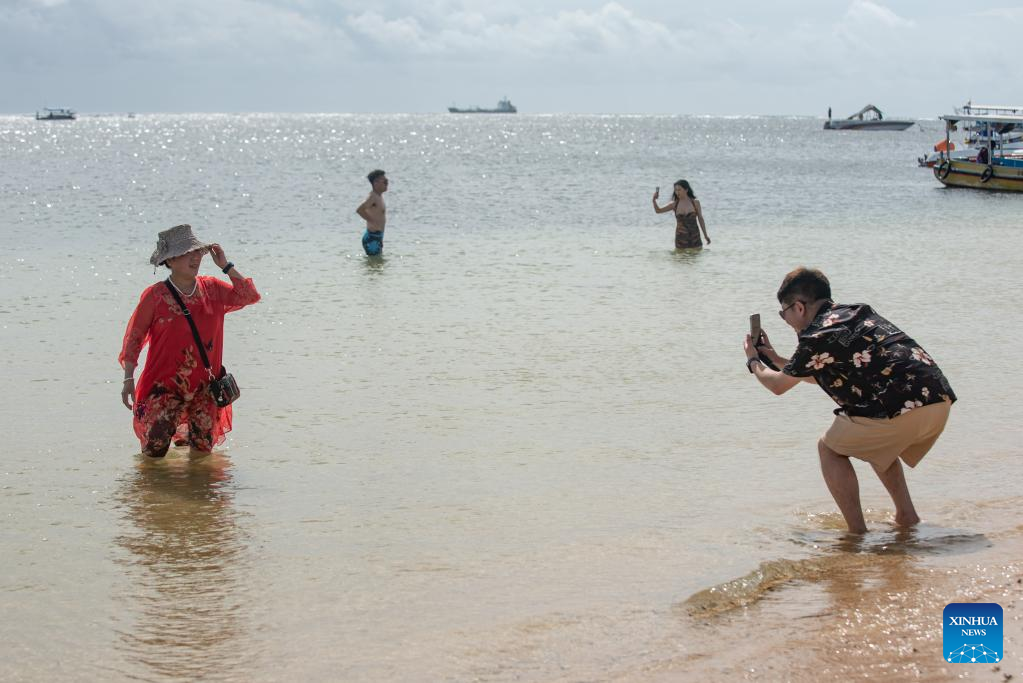 Chinese tourists take pictures on Tanjung Benoa beach in Bali, Indonesia on Feb. 13, 2023. Some 1,000 tourists from China's mainland have visited Bali since Jan. 22, 2023 when this famed resort island welcomed back this year's first batch of Chinese tourists by charter flight from Shenzhen, China. (Photo by Dicky Bisinglasi/Xinhua)