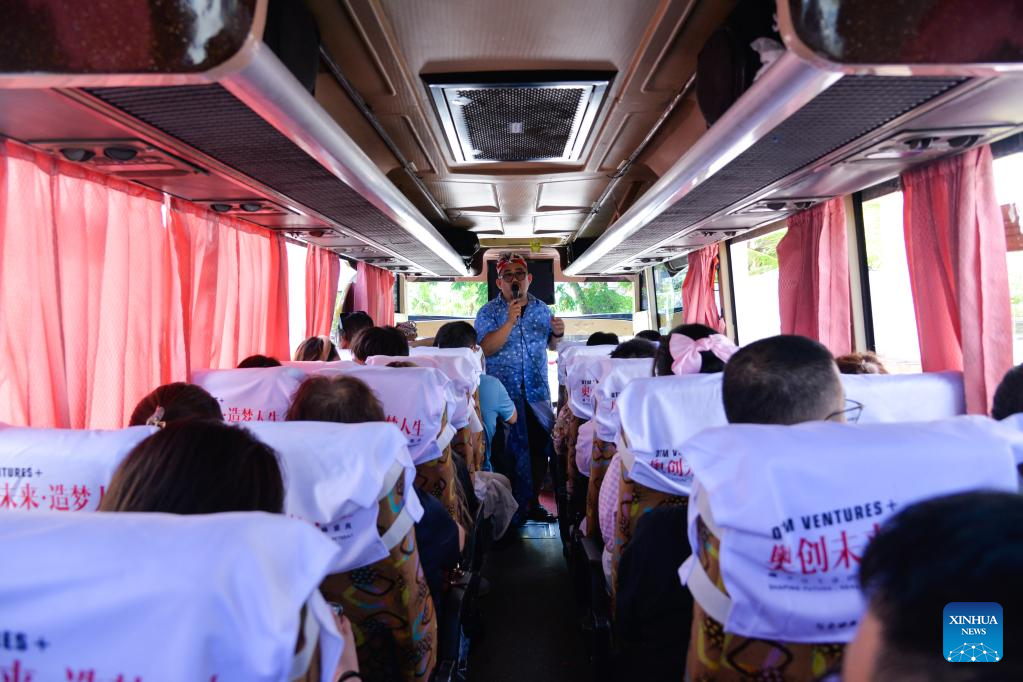 A local tour guide (C) talks to Chinese tourists on a bus departing from the Bali Denpasar Ngurah Rai International Airport to a hotel in Bali, Indonesia on Feb. 12, 2023. Some 1,000 tourists from China's mainland have visited Bali since Jan. 22, 2023 when this famed resort island welcomed back this year's first batch of Chinese tourists by charter flight from Shenzhen, China. (Xinhua/Xu Qin)