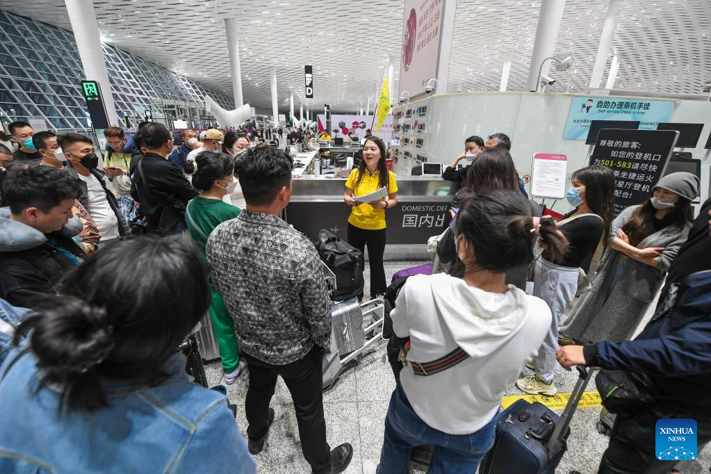 Zhang Yingying (C), leader of a group tour, briefs her clients before departing for Bali, Indonesia, at the Shenzhen airport in Shenzhen, south China's Guangdong Province, Feb. 12, 2023. Some 1,000 tourists from China's mainland have visited Bali since Jan. 22, 2023 when this famed resort island welcomed back this year's first batch of Chinese tourists by charter flight from Shenzhen, China. (Xinhua/Mao Siqian)