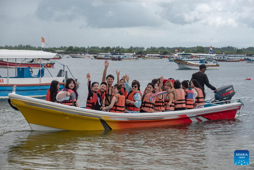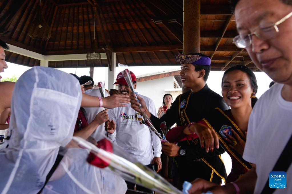 Local tourism staff present flowers to Chinese tourists on Nusa Lembongan Island, Bali, Indonesia, on Feb. 14, 2023. Some 1,000 tourists from China's mainland have visited Bali since Jan. 22, 2023 when this famed resort island welcomed back this year's first batch of Chinese tourists by charter flight from Shenzhen, China. (Xinhua/Xu Qin)
