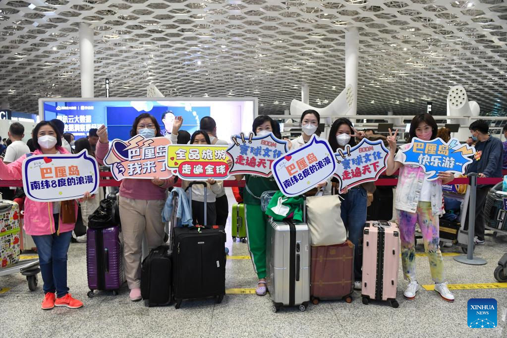Tourists pose for photos before departing for Bali, Indonesia at the Shenzhen airport in Shenzhen, south China's Guangdong Province, Feb. 12, 2023. Some 1,000 tourists from China's mainland have visited Bali since Jan. 22, 2023 when this famed resort island welcomed back this year's first batch of Chinese tourists by charter flight from Shenzhen, China. (Xinhua/Mao Siqian)