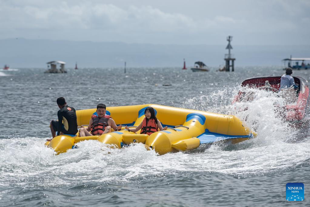 Chinese tourists enjoy water entertainment at Benoa Bay in Bali, Indonesia on Feb. 13, 2023. Some 1,000 tourists from China's mainland have visited Bali since Jan. 22, 2023 when this famed resort island welcomed back this year's first batch of Chinese tourists by charter flight from Shenzhen, China. (Photo by Dicky Bisinglasi/Xinhua)