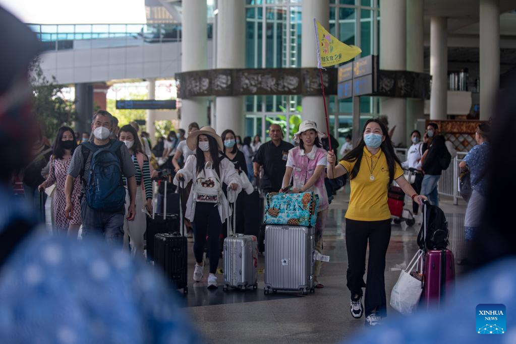 A group of Chinese tourists from Shenzhen, China, arrive at the Bali Denpasar Ngurah Rai International Airport in Bali, Indonesia, on Feb. 12, 2023. Some 1,000 tourists from China's mainland have visited Bali since Jan. 22, 2023 when this famed resort island welcomed back this year's first batch of Chinese tourists by charter flight from Shenzhen, China. (Photo by Dicky Bisinglasi/Xinhua)