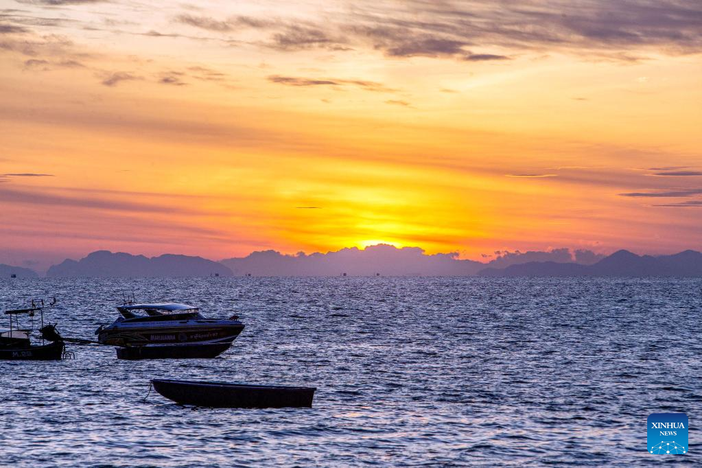This photo taken on Feb. 16, 2023 shows the sunrise at Phi Phi Islands national park in Krabi, Thailand. Phi Phi Islands national park, with an area of about 388 square kilometers, attracts numerous tourists every year. (Xinhua/Wang Teng)
