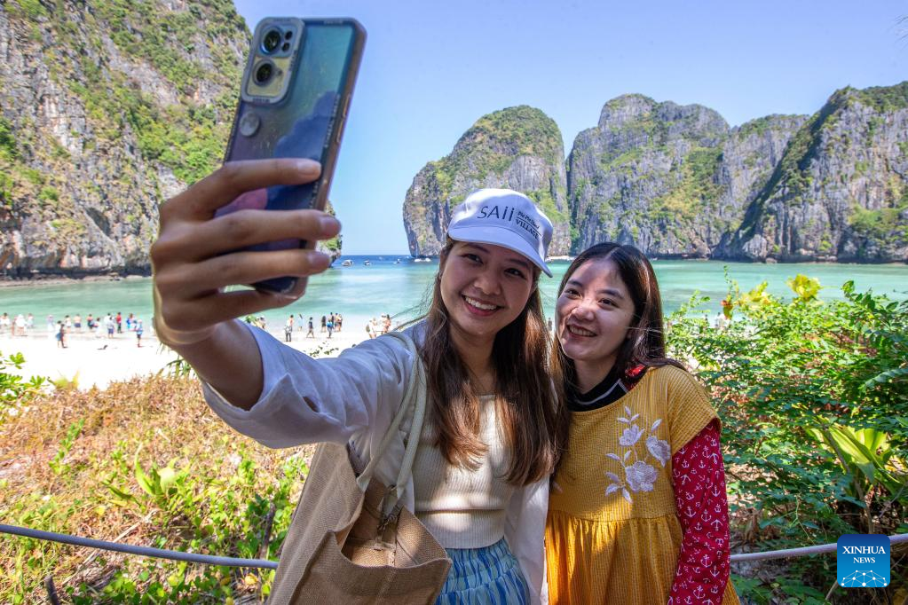 Tourists take a selfie at Phi Phi Islands national park in Krabi, Thailand, Feb. 16, 2023. Phi Phi Islands national park, with an area of about 388 square kilometers, attracts numerous tourists every year. (Xinhua/Wang Teng)