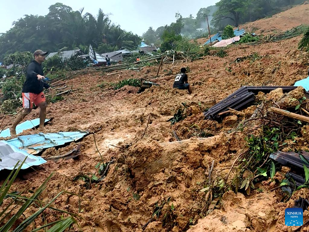 This cell phone photo provided by Indonesia's National Disaster Management Agency (BNPB) shows people inspecting the site of a landslide at Pangkalan village in Natuna district, Riau Island, Indonesia, March 6, 2023. Landslides occurred in Indonesia's western province of Riau Islands on Monday, leaving at least 10 dead and several others missing, a rescue official said in a statement. (BNPB/Handout via Xinhua)