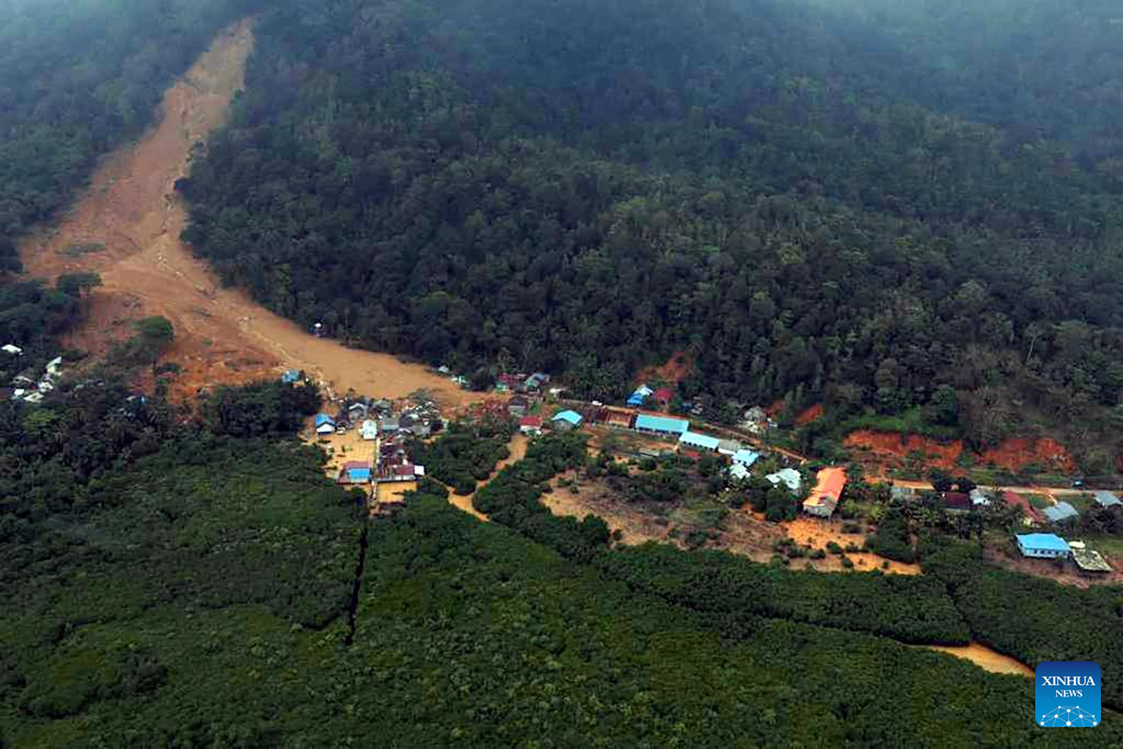 This aerial photo provided by Indonesia's National Disaster Management Agency (BNPB) shows the view after a landslide in Pangkalan village of Natuna district, Riau Island, Indonesia, March 8, 2023. Landslides occurred in Indonesia's western province of Riau Islands on Monday, leaving at least 10 dead and several others missing, a rescue official said in a statement. (BNPB/Handout via Xinhua)