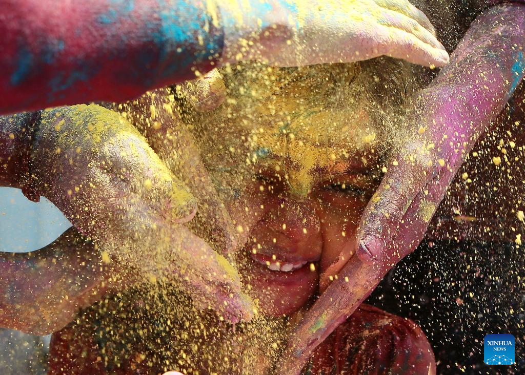 A kid plays with colored powder during the celebration of Holi Festival in Bengaluru, India, March 7, 2023. (Str/Xinhua)