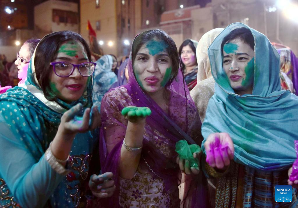 People celebrate the Holi Festival in southern Pakistani port city of Karachi on March 6, 2023. Holi, the festival of colors, marks the beginning of the spring season. (Str/Xinhua)