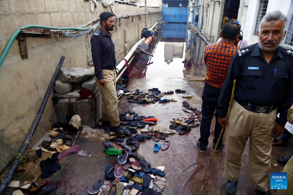 Footwear left behind by participants are seen at the site of stampede in southern Pakistani port city of Karachi on March 31, 2023. At least 11 people were killed and more than 10 others injured in a stampede during ration distribution in Pakistan's southern port city of Karachi of Sindh province on Friday, police and rescue officials said. (Str/Xinhua)