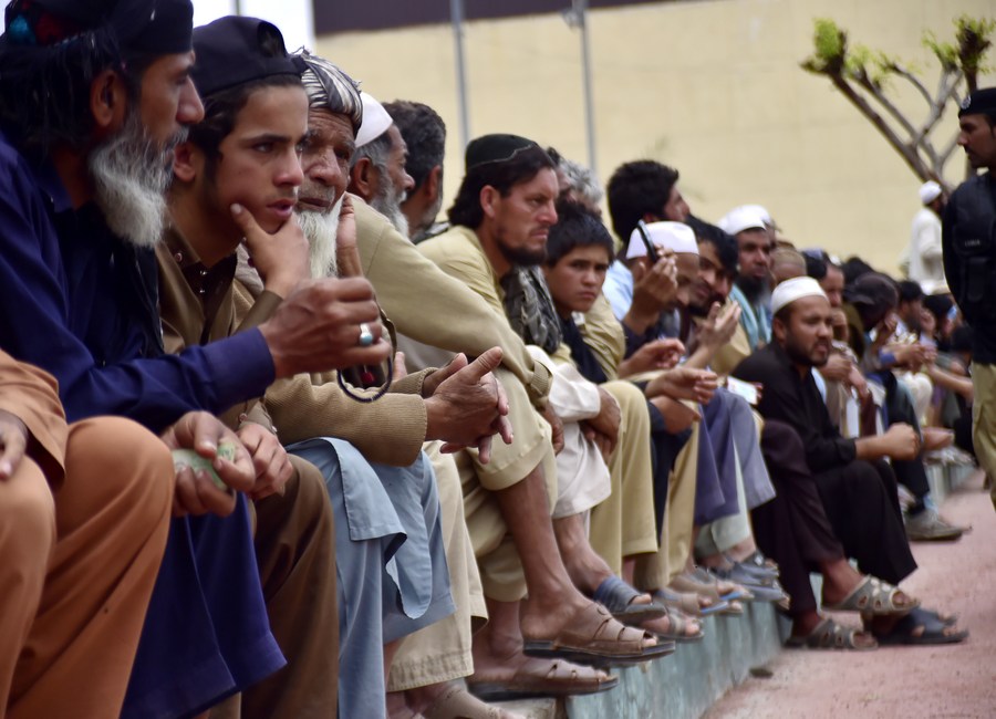 People wait to receive free flour from a government distribution site in northwest Pakistan's Peshawar on April 1, 2023. (Photo by Saeed Ahmad/Xinhua)
