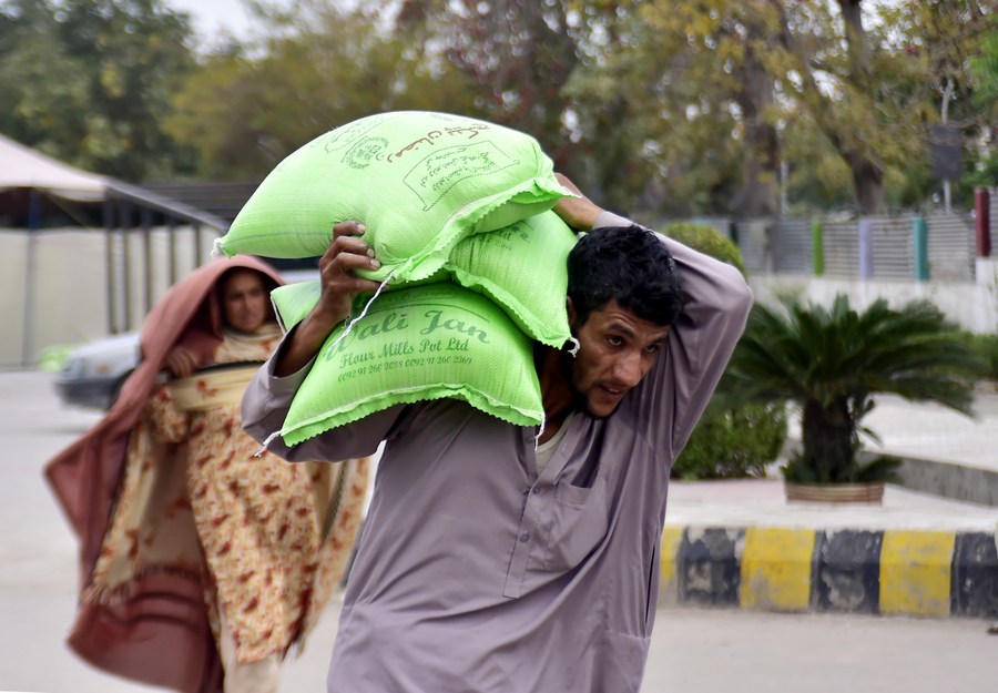 A man leaves after receiving free flour from a government distribution site in northwest Pakistan's Peshawar on April 1, 2023. (Photo by Saeed Ahmad/Xinhua)