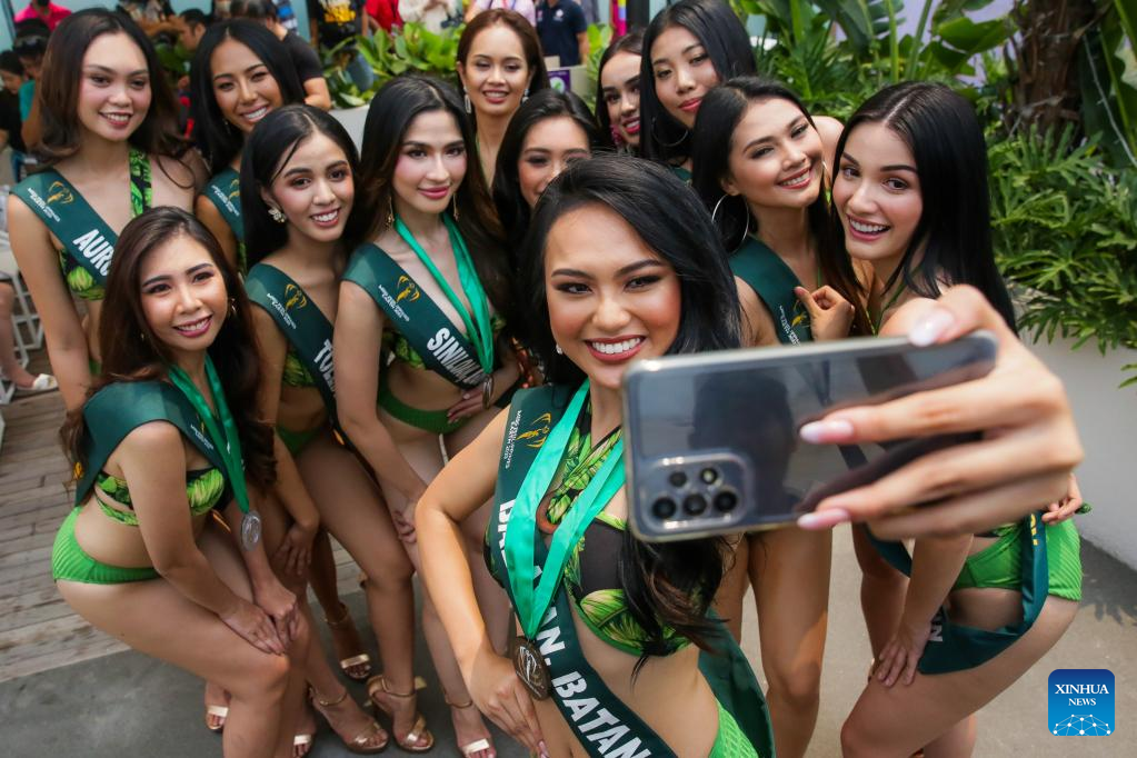 Candidates take selfies during a media presentation of the Miss Philippines Earth 2023 in Pasay City, the Philippines, April 3, 2023. (Xinhua/Rouelle Umali)