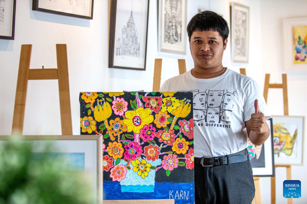 An autistic man shows his painting at the Thai Autism Vocational Center in Bangkok, Thailand, April 2, 2023.