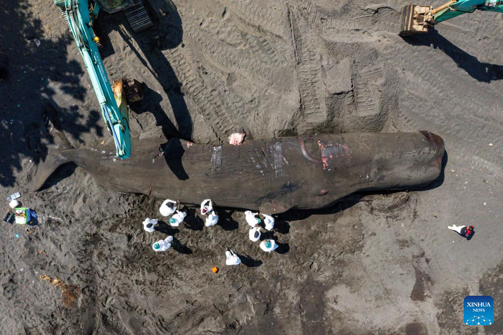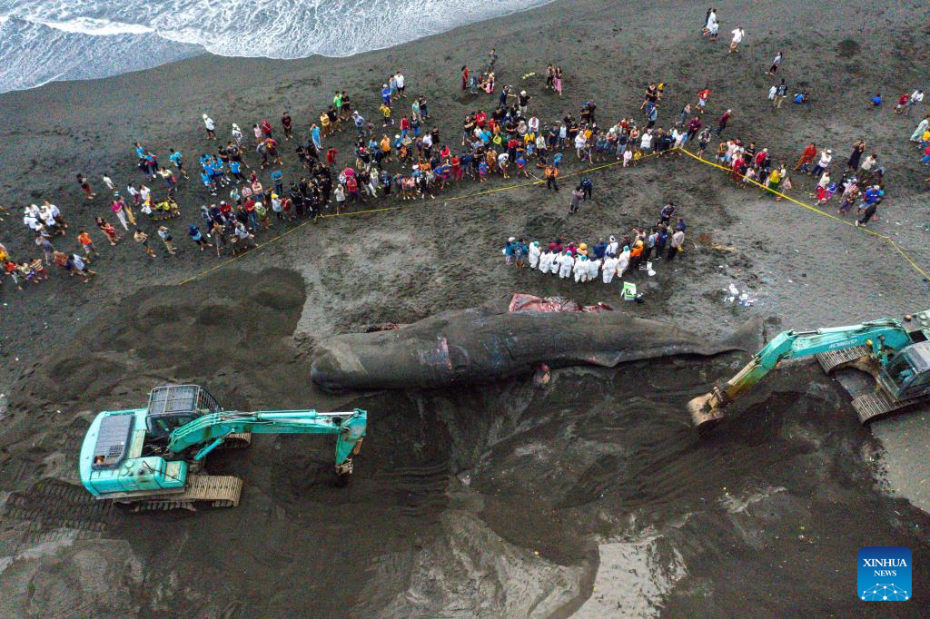 This aerial photo shows veterinaries performing an examination of a stranded sperm whale at Yeh Malet Beach in Klungkung, Bali, Indonesia, April 6, 2023. (Photo by Dicky Bisinglasi/Xinhua)