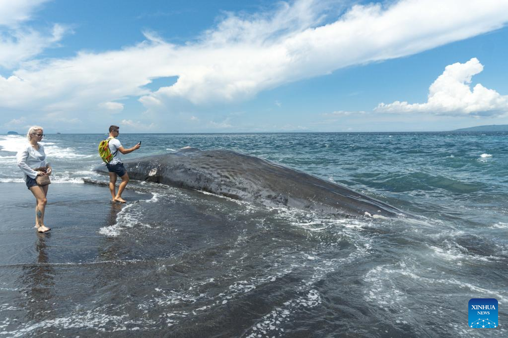 People walk near a stranded sperm whale at Yeh Malet Beach in Klungkung, Bali, Indonesia, April 6, 2023. (Photo by Dicky Bisinglasi/Xinhua)