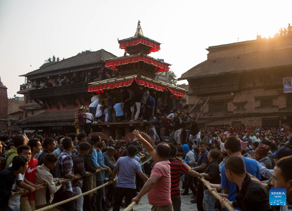 People pull the chariot of Lord Bhairav during the first day of the Bisket Jatra Festival at Bhaktapur Durbar Square in Bhaktapur, Nepal, April 10, 2023. The festival is celebrated annually to welcome the arrival of spring and the start of Nepali New Year. (Photo by Sulav Shrestha/Xinhua)