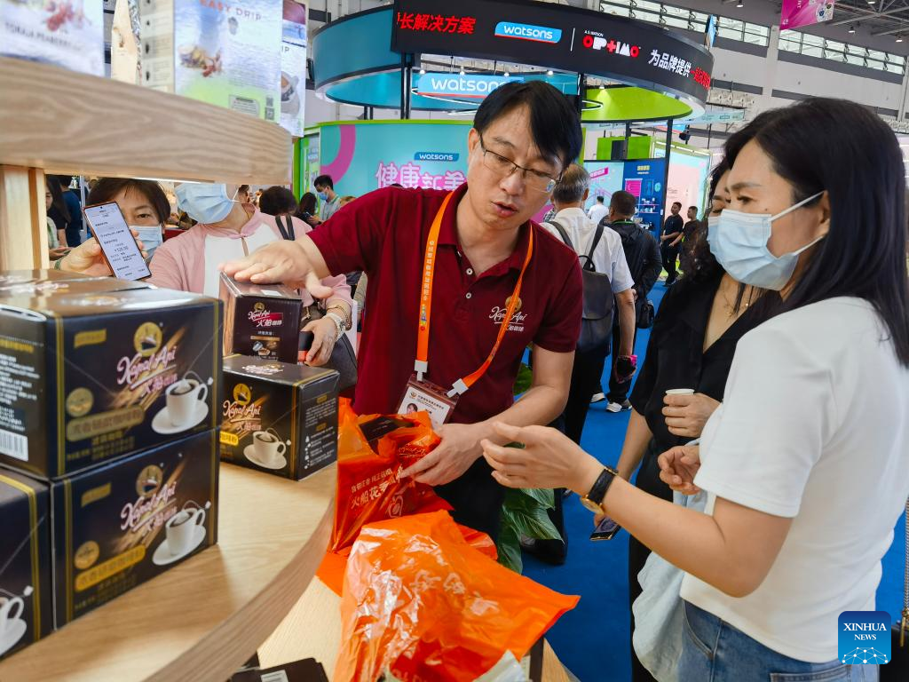 A staff member introduces products to visitors at the pavilion of Indonesia's leading coffee company Kapal Api at the third China International Consumer Products Expo (CICPE) in Haikou, capital city of south China's Hainan Province, on April 12, 2023. (Xinhua/Zhou Huimin)