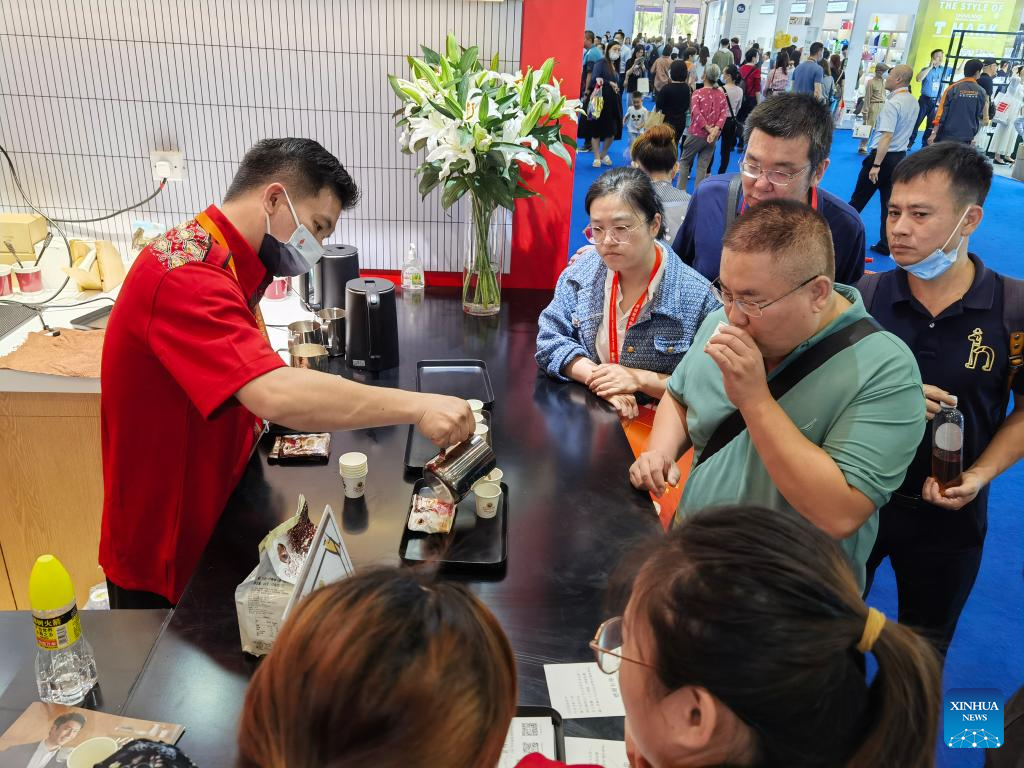 A barista prepares coffee for visitors at the pavilion of Indonesia's leading coffee company Kapal Api at the third China International Consumer Products Expo (CICPE) in Haikou, capital city of south China's Hainan Province, on April 12, 2023. (Xinhua/Zhou Huimin)