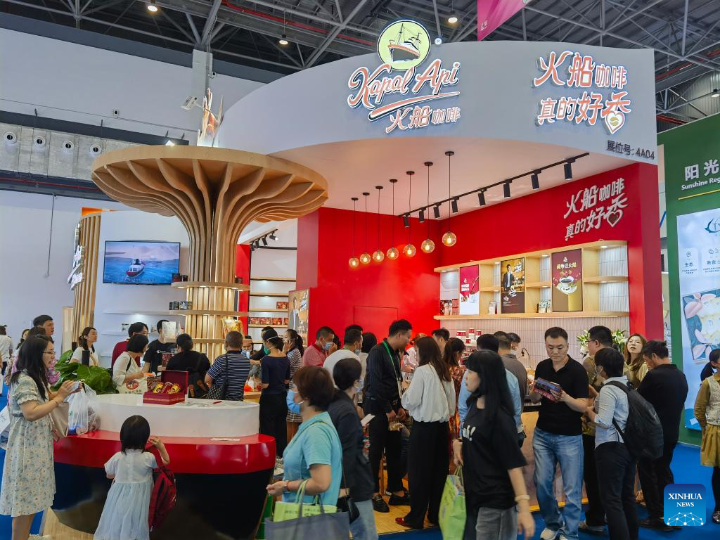 People visit the pavilion of Indonesia's leading coffee company Kapal Api at the third China International Consumer Products Expo (CICPE) in Haikou, capital city of south China's Hainan Province, on April 12, 2023. (Xinhua/Zhou Huimin)