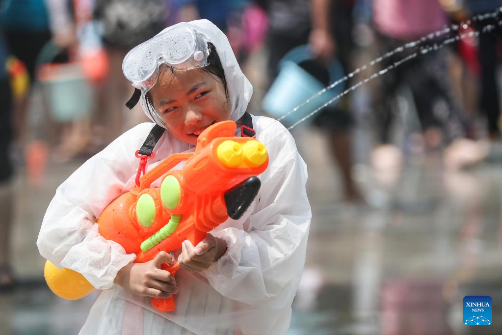 A girl plays with a toy water gun during the celebration of water-splashing festival at a square in Jinghong City, Dai Autonomous Prefecture of Xishuangbanna, southwest China's Yunnan Province, April 15, 2023. (Xinhua/Shan Yuqi)