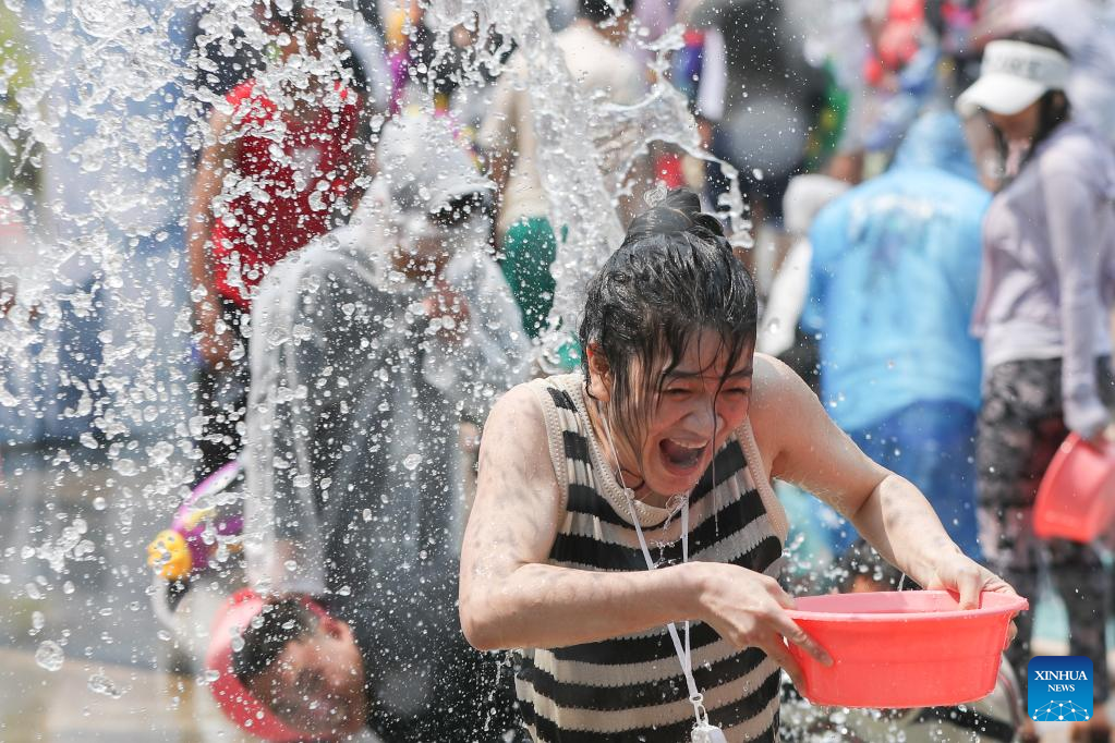 People splash water on one another to celebrate the water-splashing festival at a square in Jinghong City, Dai Autonomous Prefecture of Xishuangbanna, southwest China's Yunnan Province, April 15, 2023. (Xinhua/Shan Yuqi)